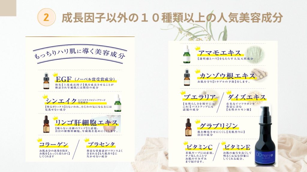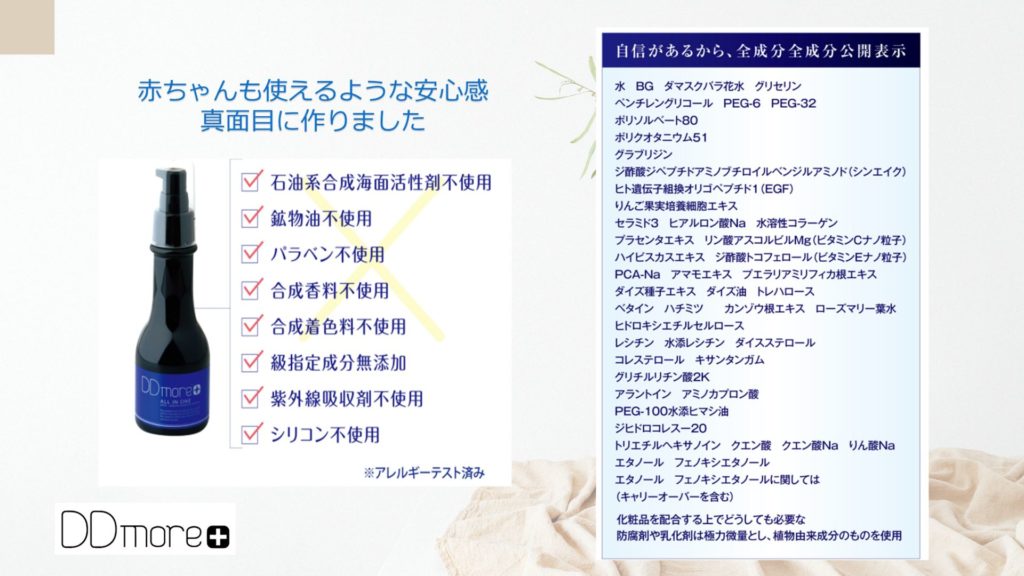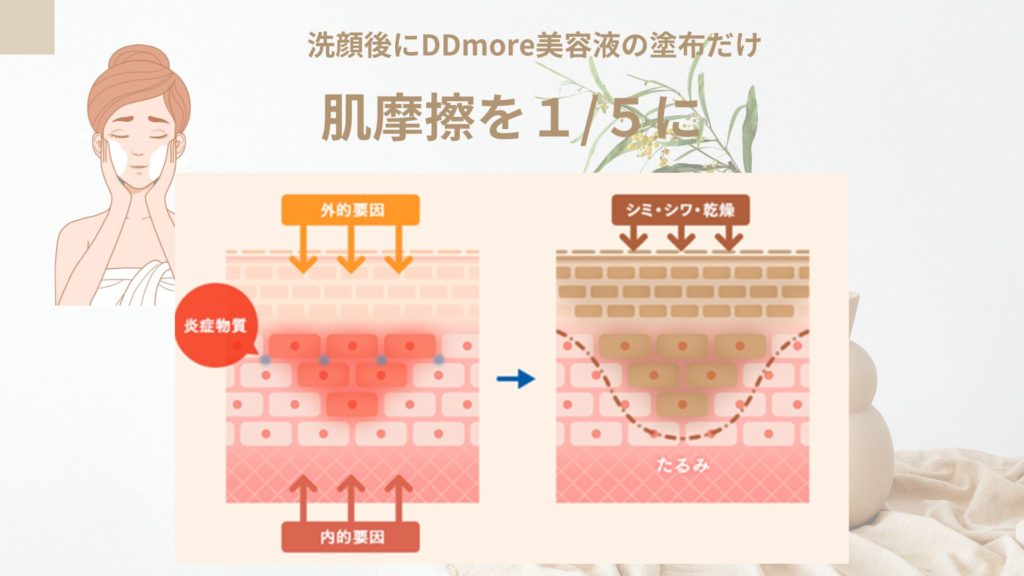 肌刺激を無くすためにも、シンプルケアが必要と考えています。一本でも肌⽔分量をアップし保持する成分をしっかり 配合しました。 肌乾燥が強いドライ肌、日焼け直後には、⼀度塗布したら 時間をおいて再度塗布します。手のひらが肌に吸い付くような、これまで体感したことのないもちもち 肌を実感できます。 洗顔後にDDmore美容液1本で1回に2~3プッシュで完了するのでコスパが良いのはもちろん。年齢肌に必要とされる成分を1本の美容液でバランスよく配合しているので、無駄がありません。