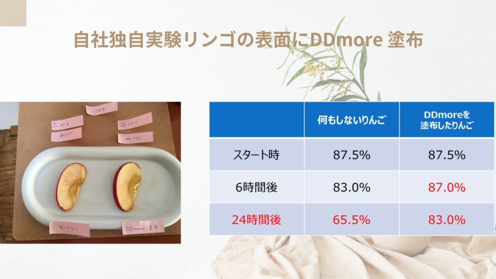 切ったリンゴの断面にDDmoreを塗布して水分計で計測する実験を行ったところ。24時間後も高い数値をキープしていることが分かりました。