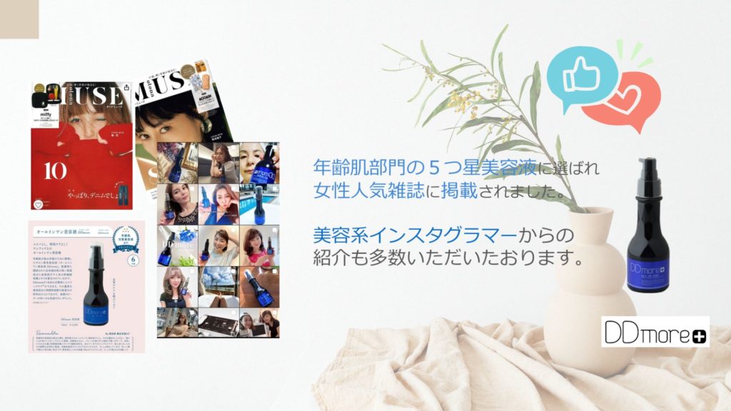 DDmore美容液は加齢とともに現れる、しわ、たるみ、シミ等の肌悩みに特化しています。