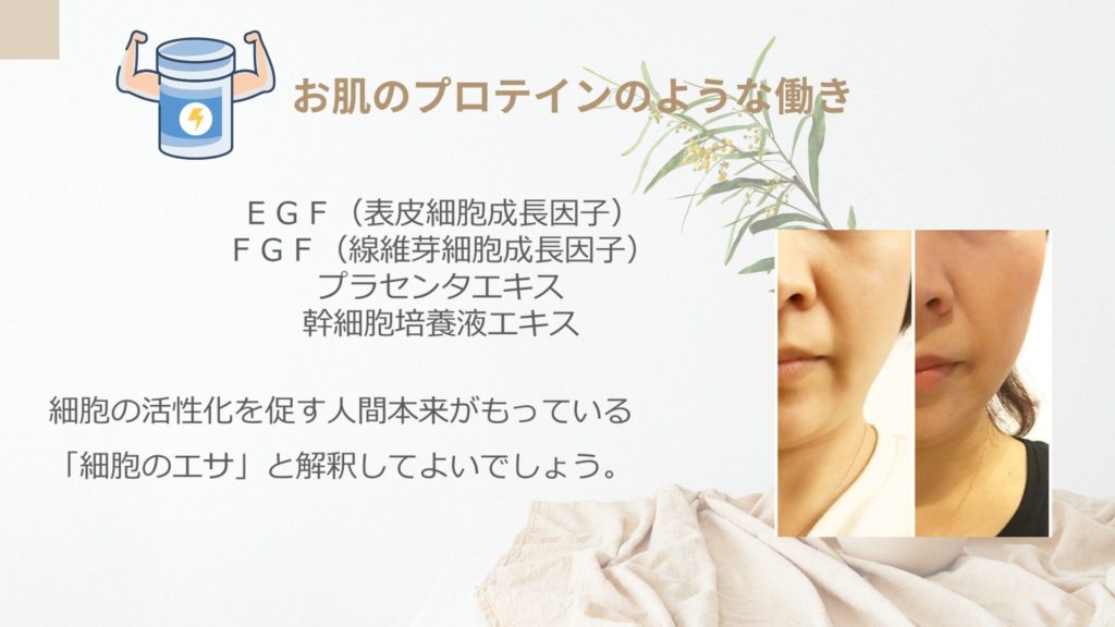 厳選された成分と 肌に刺激となる成分は使わないというこだわりの元。活力の無くなってきている年齢肌の活性化を⽬的とした「肝細胞培養エキス」・「EGF」など複数の「成長因子」を配合し、それら相乗効果を高める処方は、「製造工程に手間のかかる独 ⾃の秘伝ブレンド」です。
